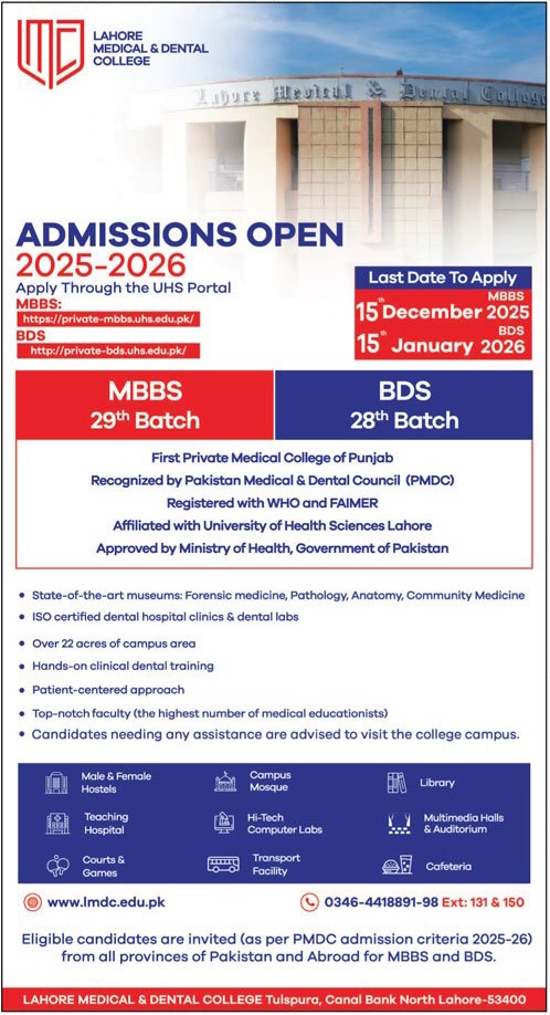 - Lahore Medical & Dental College (LMDC) Lahore Admissions 2025-2026 for MBBS BDS