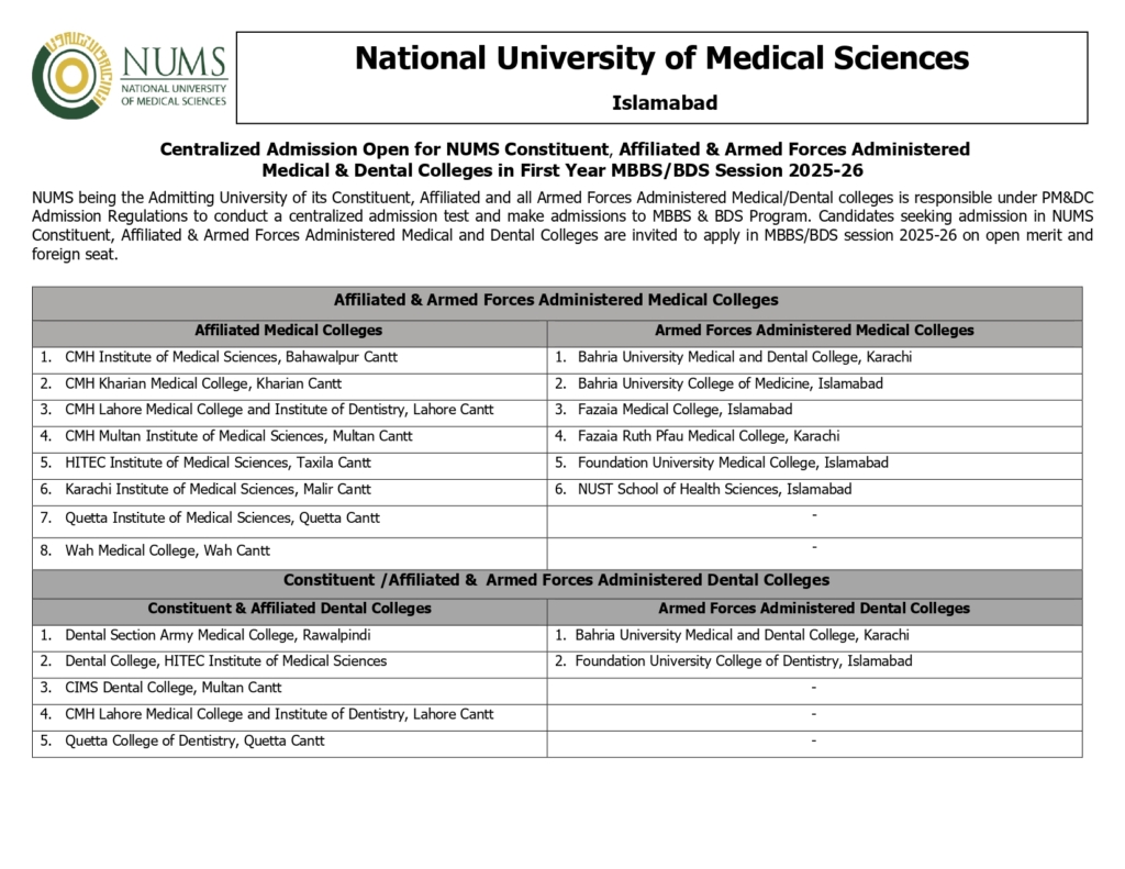 - NUMS MBBS & BDS-Session (2025-2026) Combined Advertisement for Centralized Admissions.
