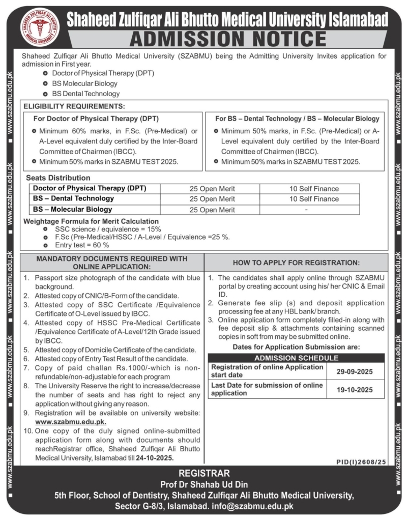 - Shaheed Zulfiqar Ali Bhutto Medical University – Islamabad Admissions – Fall 2025